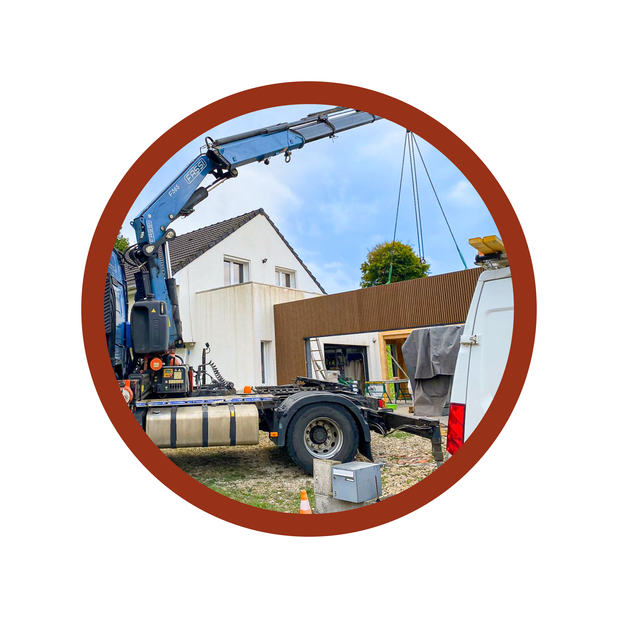 Votre projet est alors installé murs par murs grâce à notre grue, directement sur la dalle béton prévue à cet effet. Déjà bardés en atelier ou non, cela dépend alors de la complexité du chantier et du transport jusque sur site de pose.