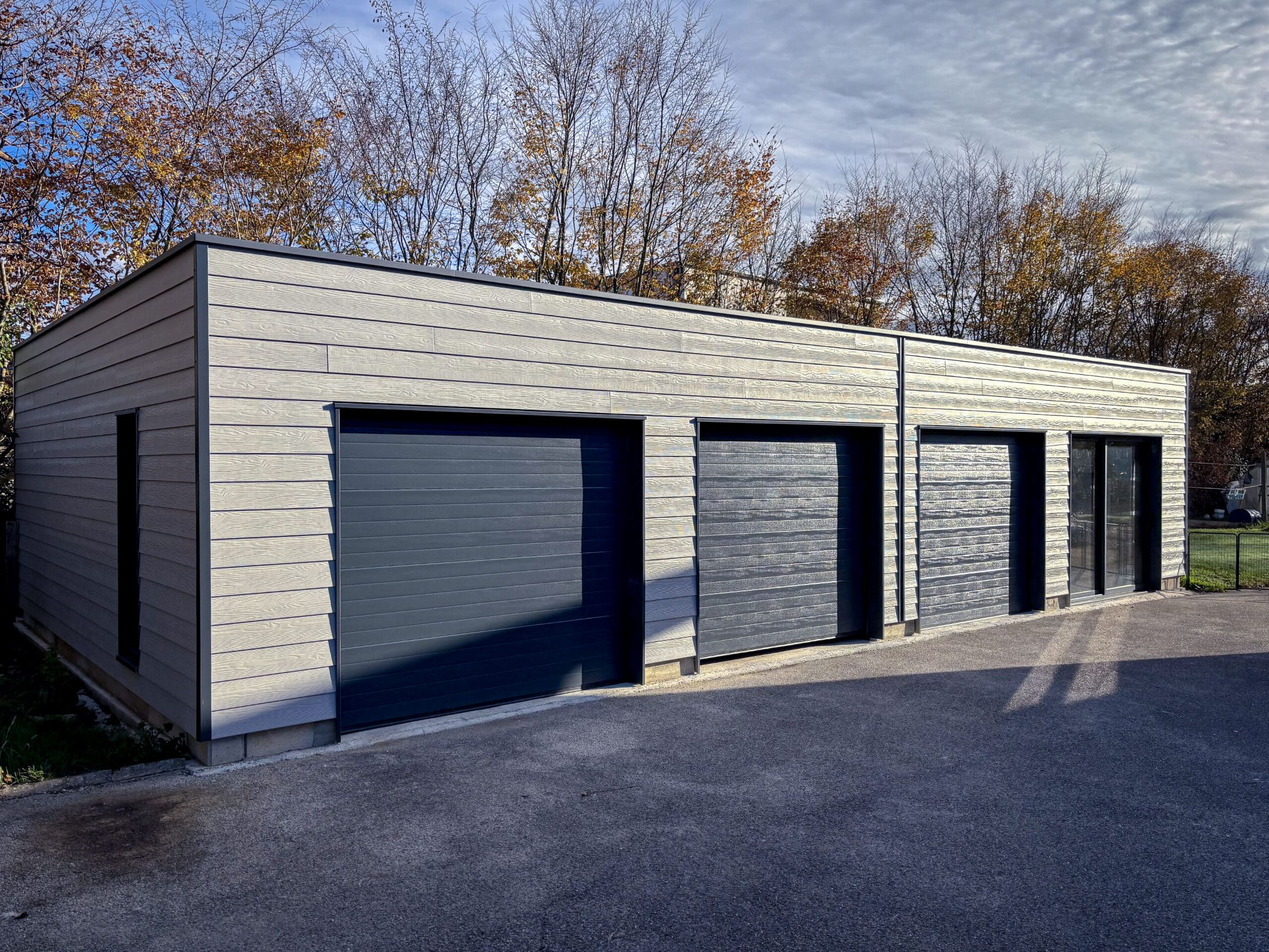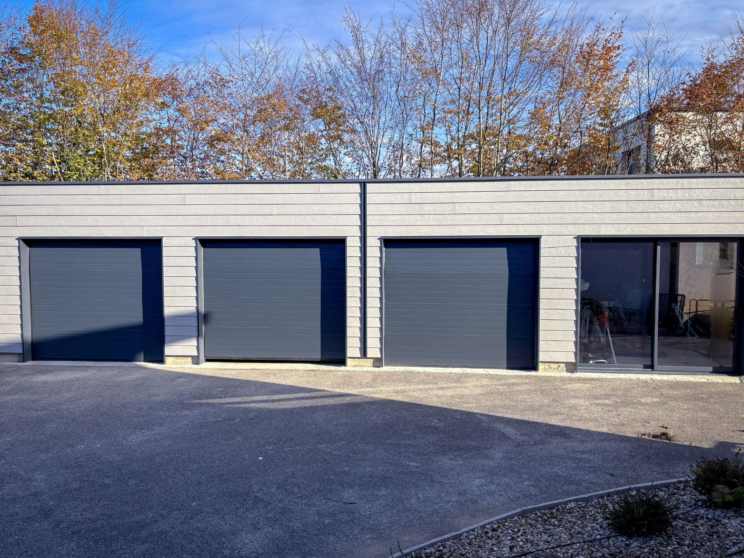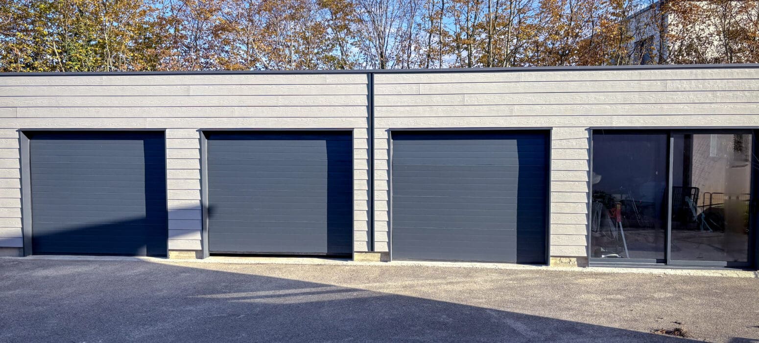Garage moderne en ossature bois à trois portes sectionnelles anthracite, revêtu d'un bardage Cedral Gris argent, avec toit plat, réalisé dans le Jura (39)
