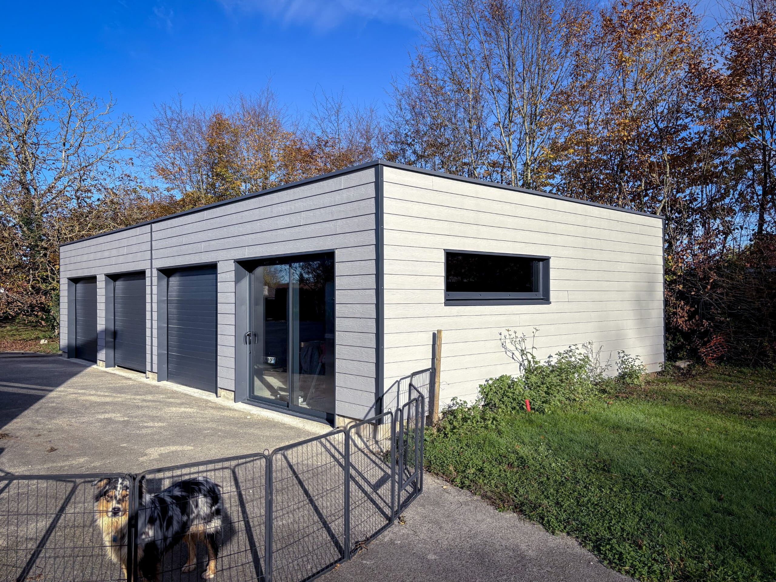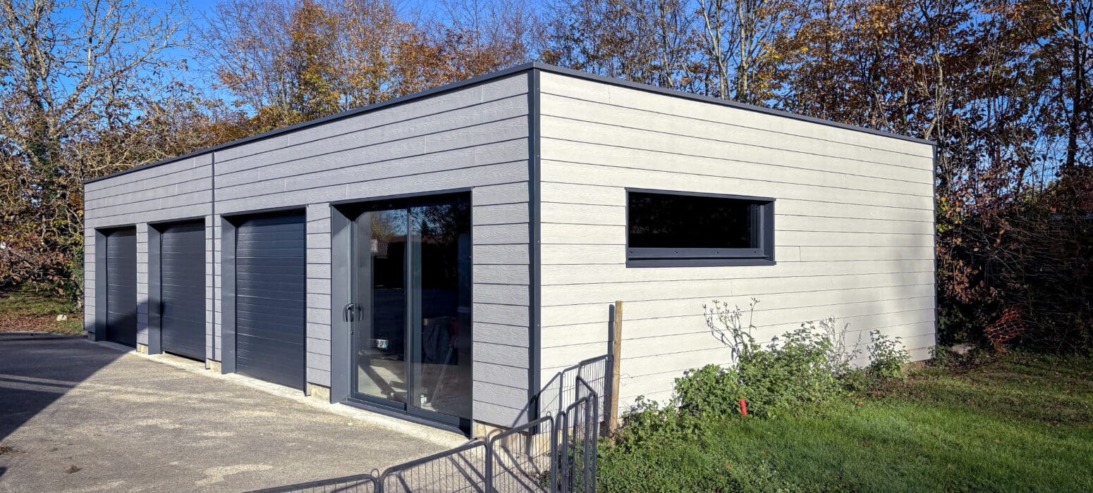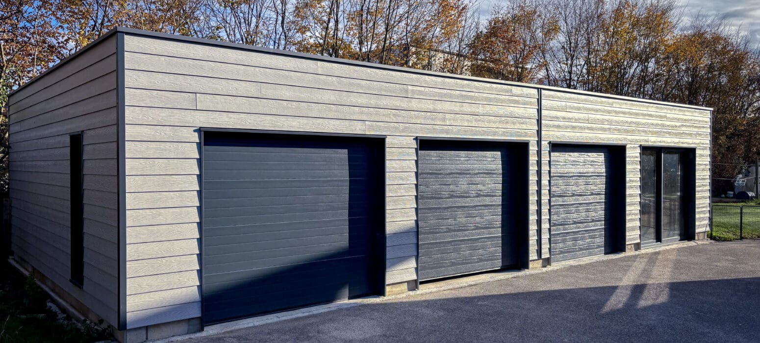 Garage moderne en ossature bois à trois portes sectionnelles anthracite, revêtu d'un bardage Cedral Gris argent, avec toit plat, réalisé dans le Jura (39)